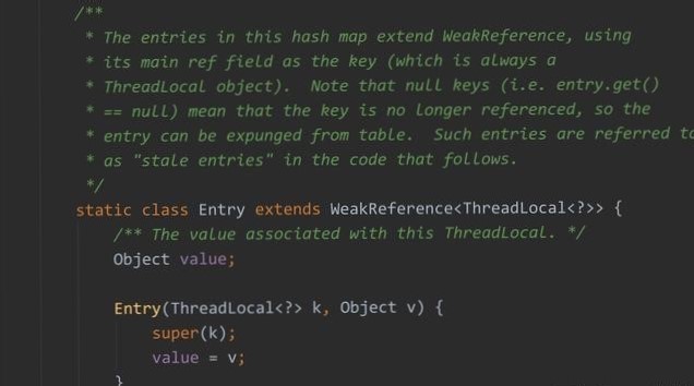 ThreadLocalMap是ThreadLocal的内部类,每个数据用Entry保存,其中的Entry继承与WeakReference,用一个键值对存储,键为ThreadLocal的引用。为什么是WeakReference呢?如果是强引用,即使把ThreadLocal设置为null,GC也不会回收,因为ThreadLocalMap对它有强引用。
