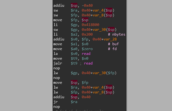 $fp寄存器的值,在我们溢出后函数结束时,就会被栈里的值覆盖,因此,$fp可控,从而$v0可控,从而$a1可控。而$a0、$a2也在代码里控制住了。因此,我们让$a1指向bss段,从而可以向bss段输入shellcode。当read结束后, move $sp, $fp指令会使得栈发生迁移,我们在bss段的shellcode前面放置shellcode的地址,,这样shellcode的地址就会被放入到$ra寄存器,进而可以ret到shellcode。