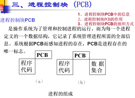 进程控制块(PCB):为了描述和控制进程运行系统为每个进程定义的数据结构,记录了OS所需的、用于描述进程当前情况以及控制进程运行的全部信息。