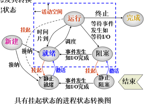 七状态:挂起状态(暂时被淘汰出内存的进程)(引入原因:终端用户请求、父进程请求、负荷调节需要、操作系统需要)