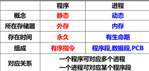 3)程序仅是指令的有序集合,而进程则由程序段、相关数据段、进程控制块(PCB)组成。
