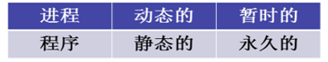 2)程序的存在是永久的,而进程则是有生命期的,它因创建而产生,因调度而执行,因得不到资源而暂停,因撤消而消亡。
