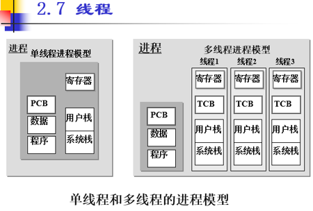 线程的内容:程序计数器、寄存器组(不运行时需要保存上下文)、堆栈、子线程、状态(可转换)