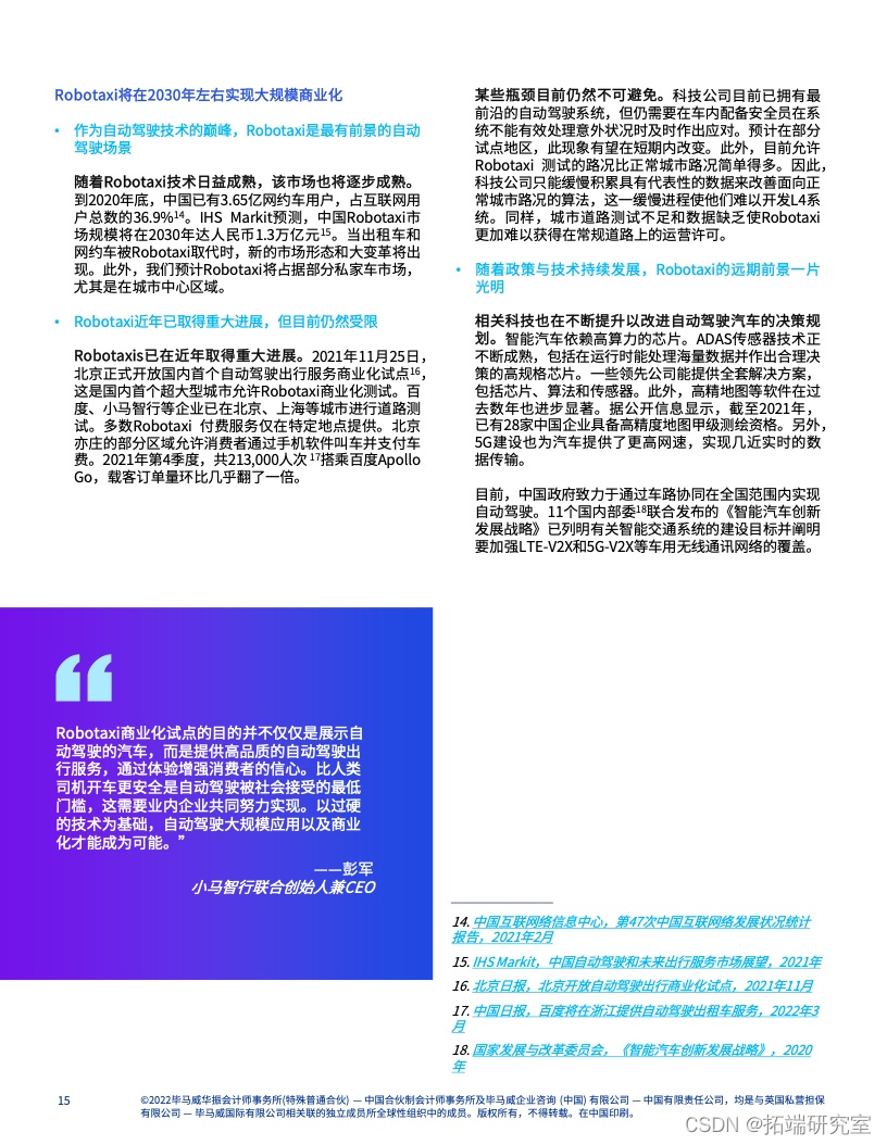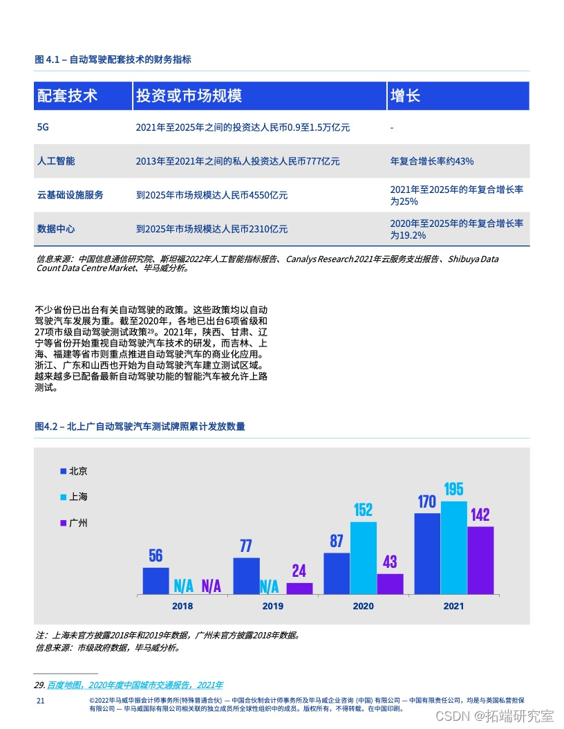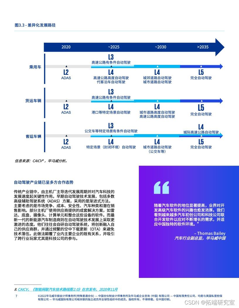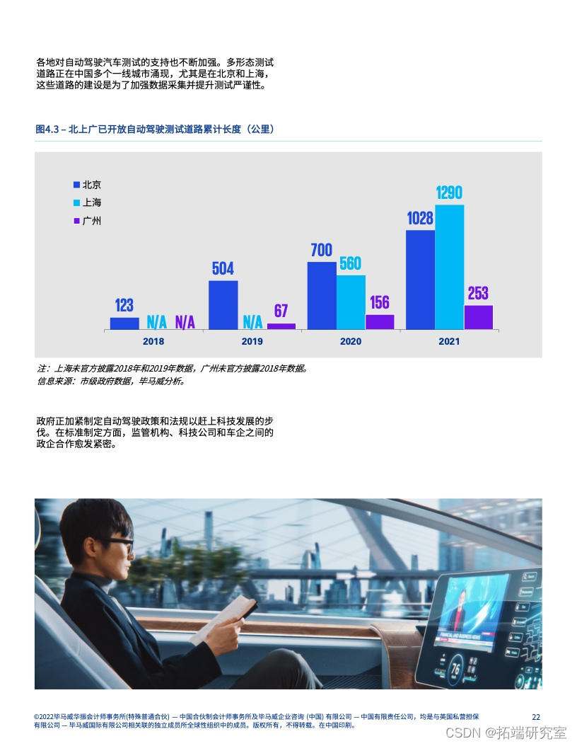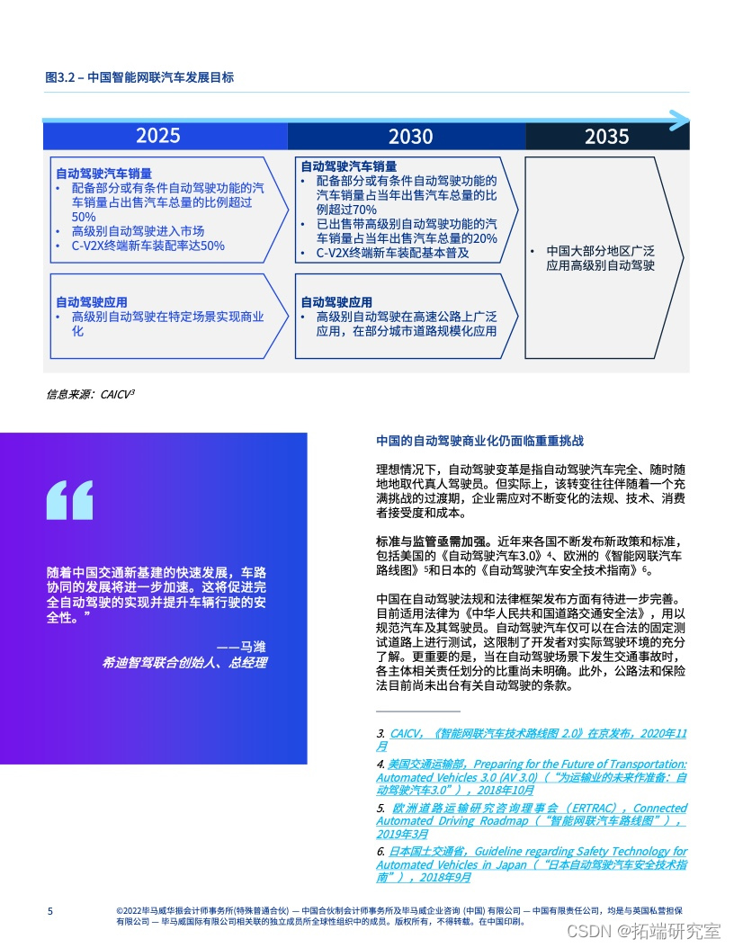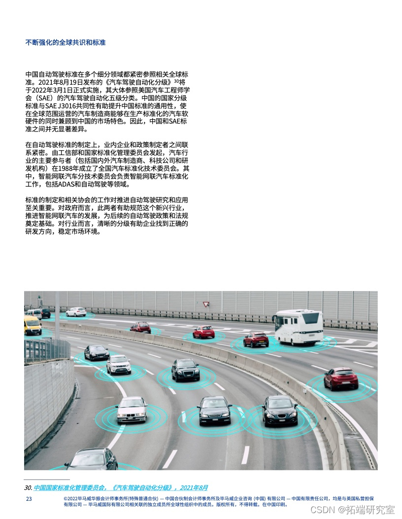 标准与监管亟需加强。近年来各国不断发布新政策和标准,包括美国的《自动驾驶汽车3.0》4、欧洲的《智能网联汽车路线图》5和日本的《自动驾驶汽车安全技术指南》6。