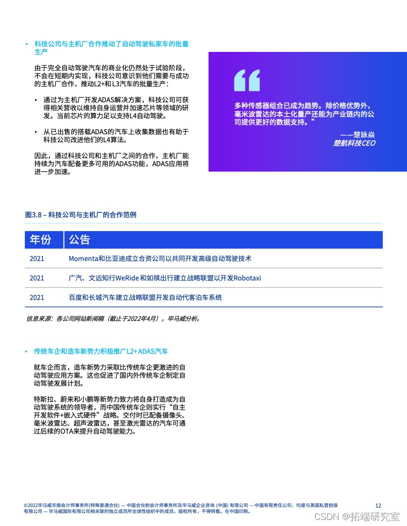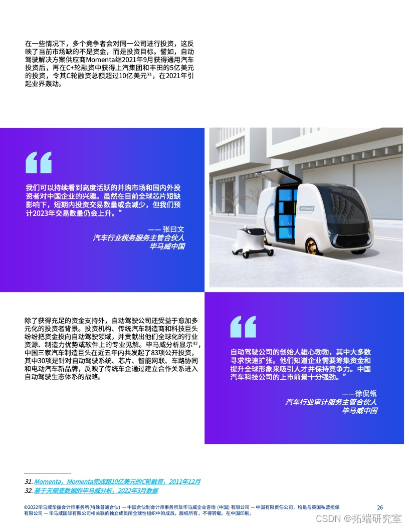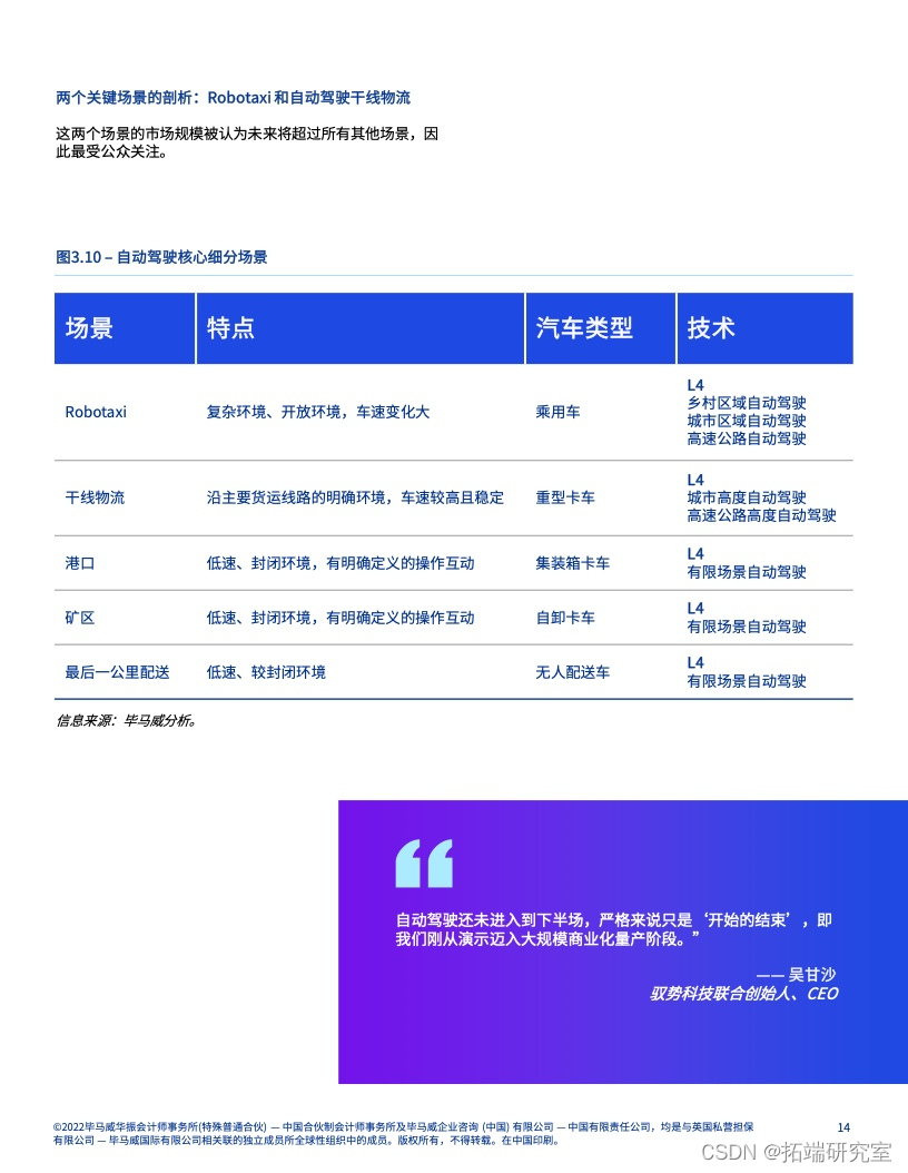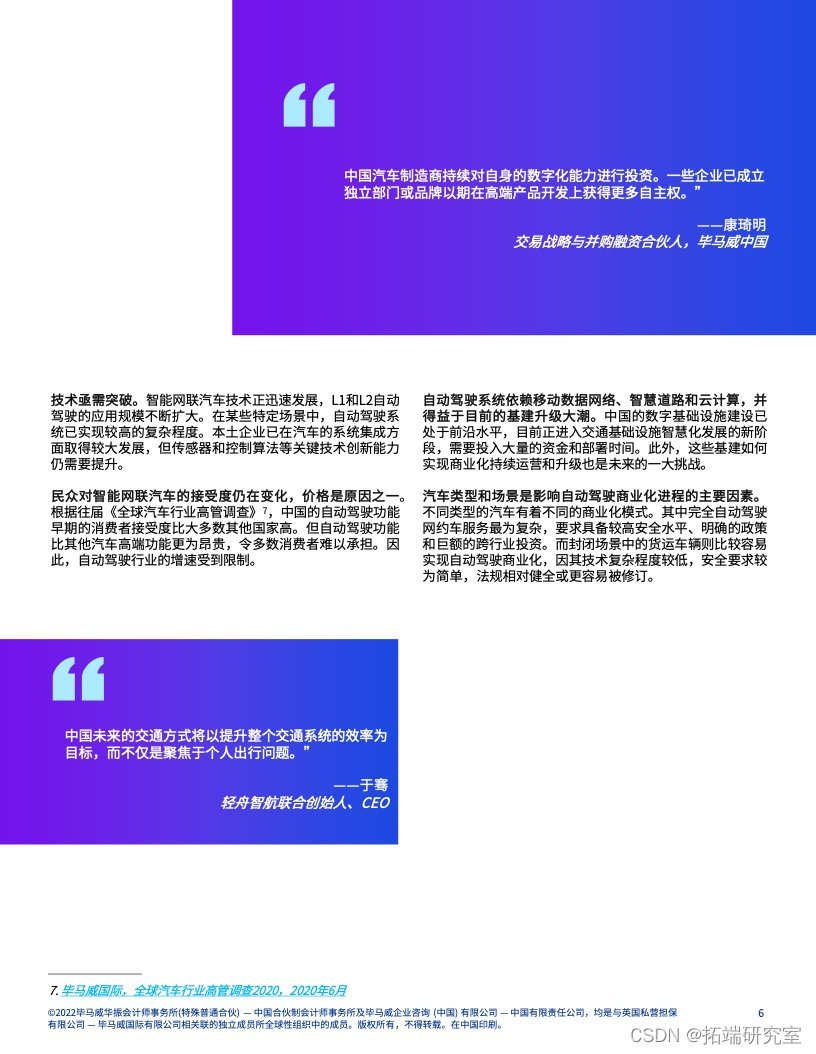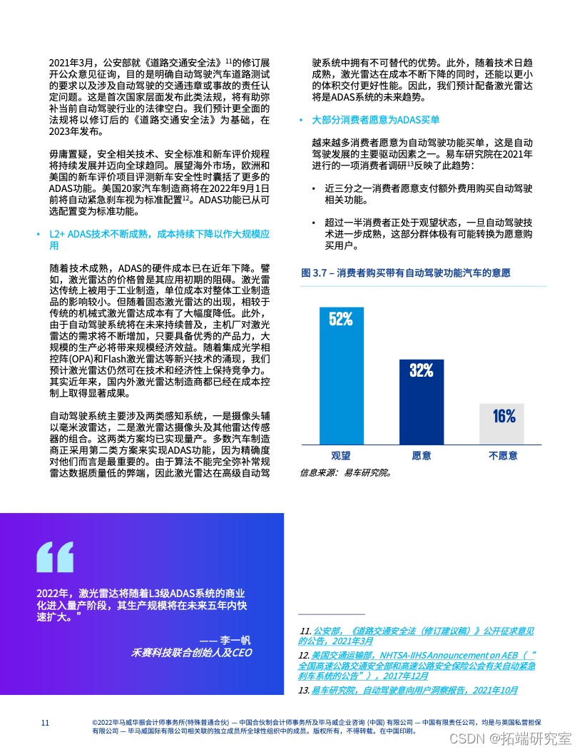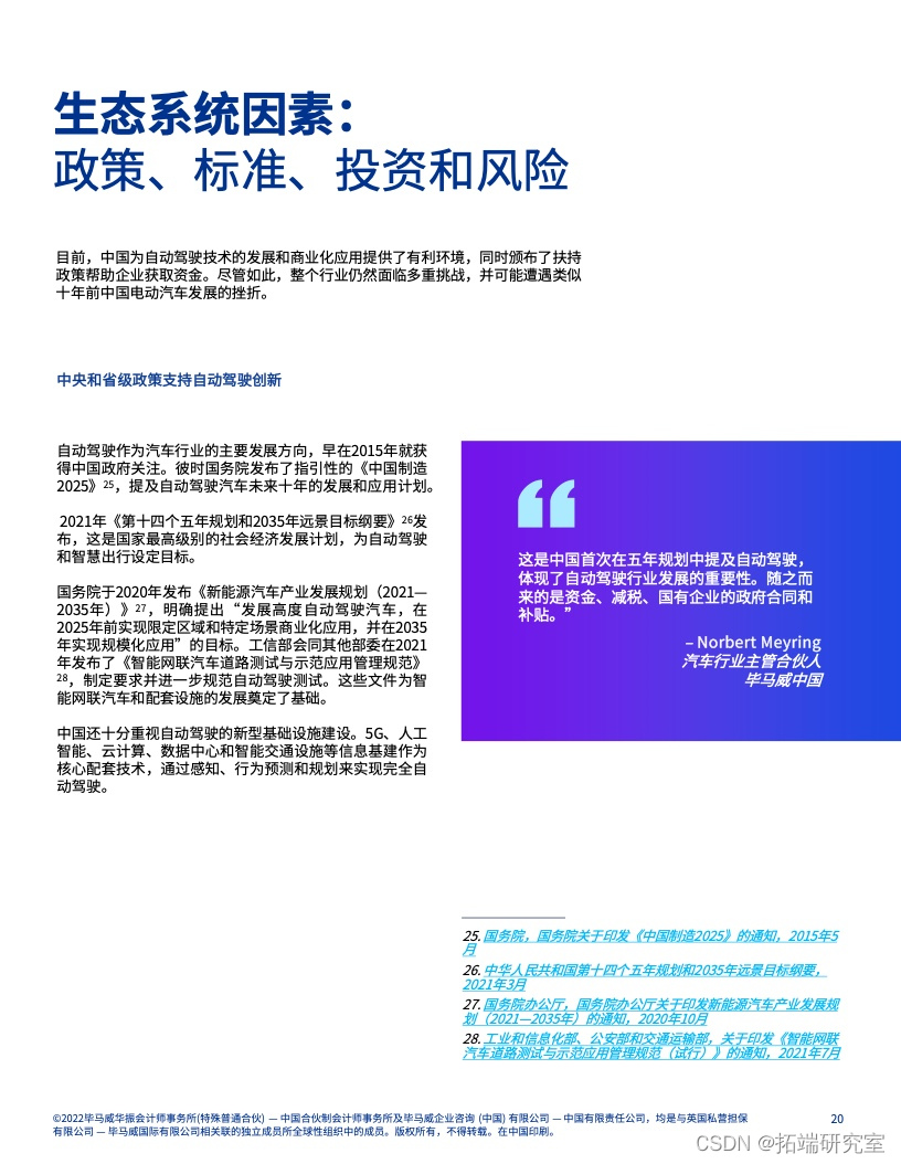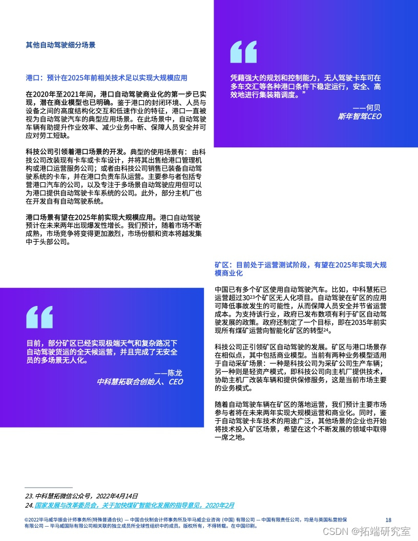 标准与监管亟需加强。近年来各国不断发布新政策和标准,包括美国的《自动驾驶汽车3.0》4、欧洲的《智能网联汽车路线图》5和日本的《自动驾驶汽车安全技术指南》6。