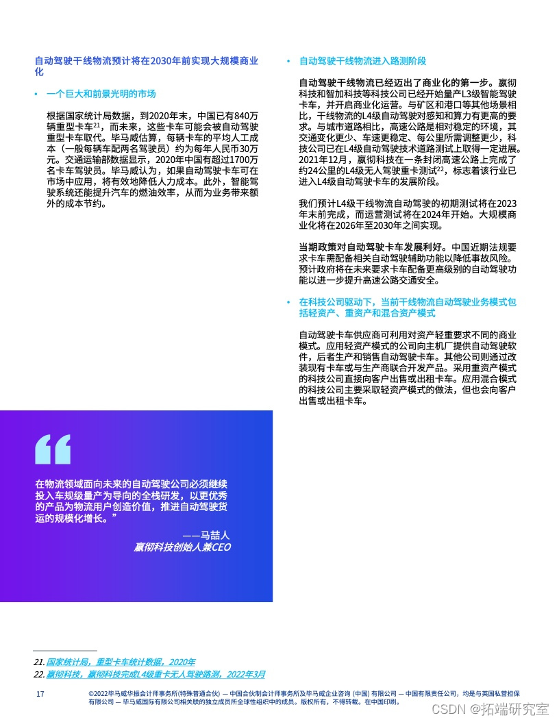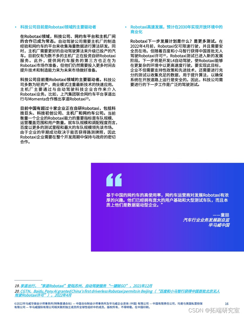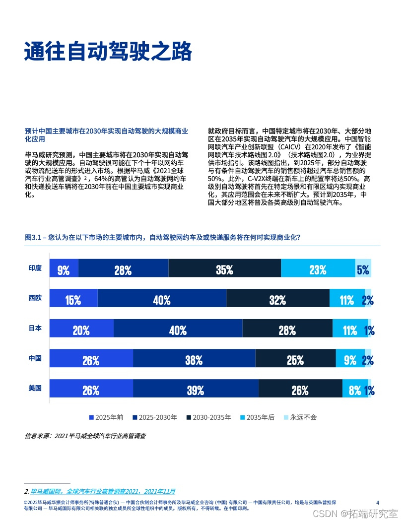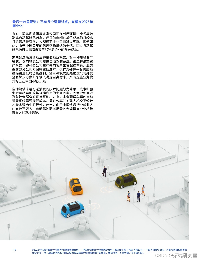 研究预测,中国主要城市将在2030年实现自动驾驶的大规模应用。自动驾驶很可能在下个十年以网约车或物流配送车的形式进入市场。64%的高管认为自动驾驶网约车和快递投送车辆将在2030年前在中国主要城市实现商业化。