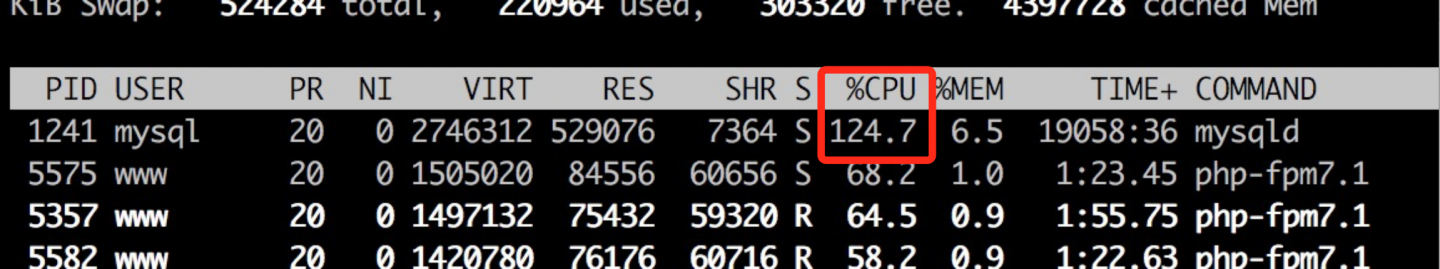 CPU 使用率居高不下,有时候还伴随着 MySQL 爆掉的情况,如下图。当这种情况发生时,你就会发现网页请求卡住不动: