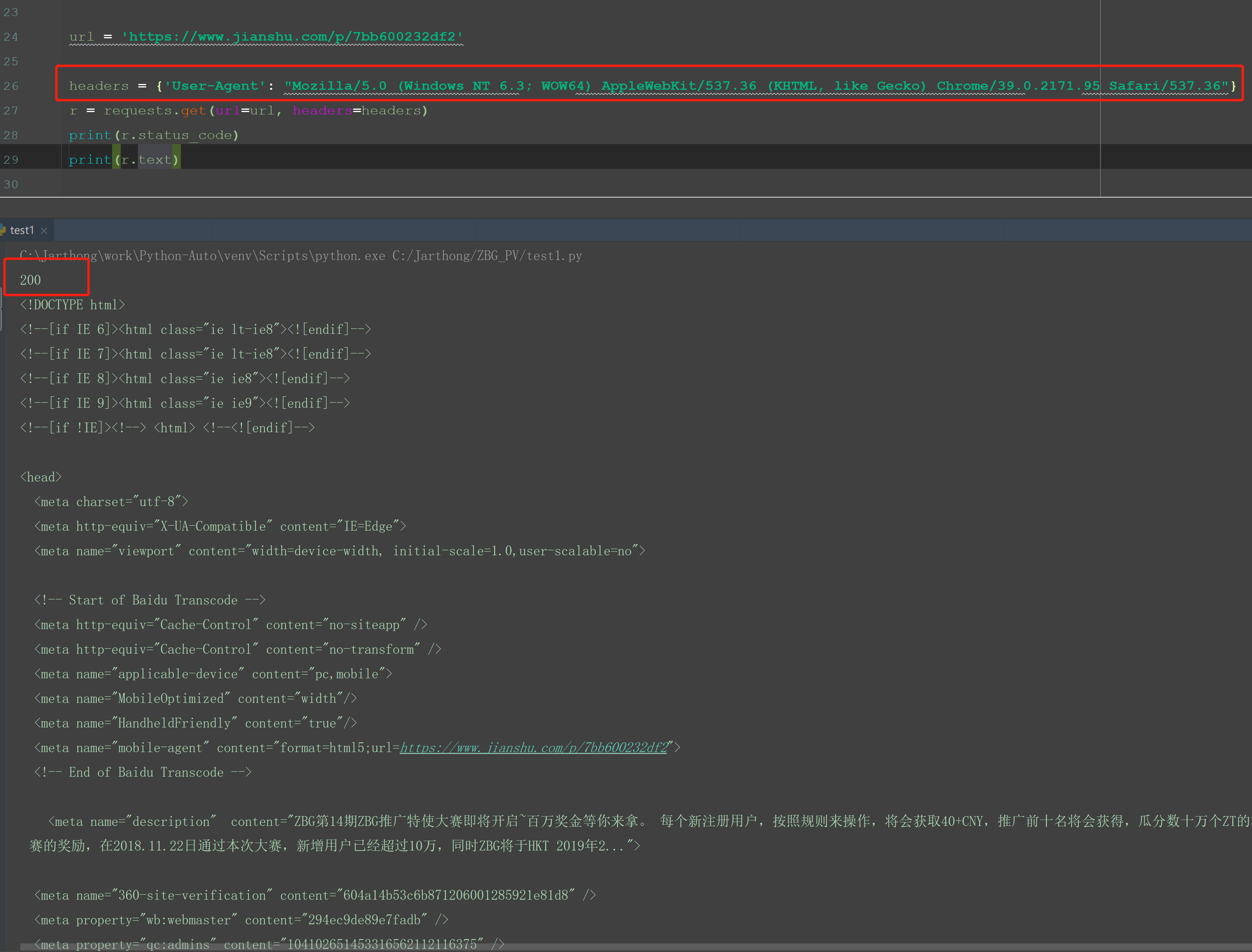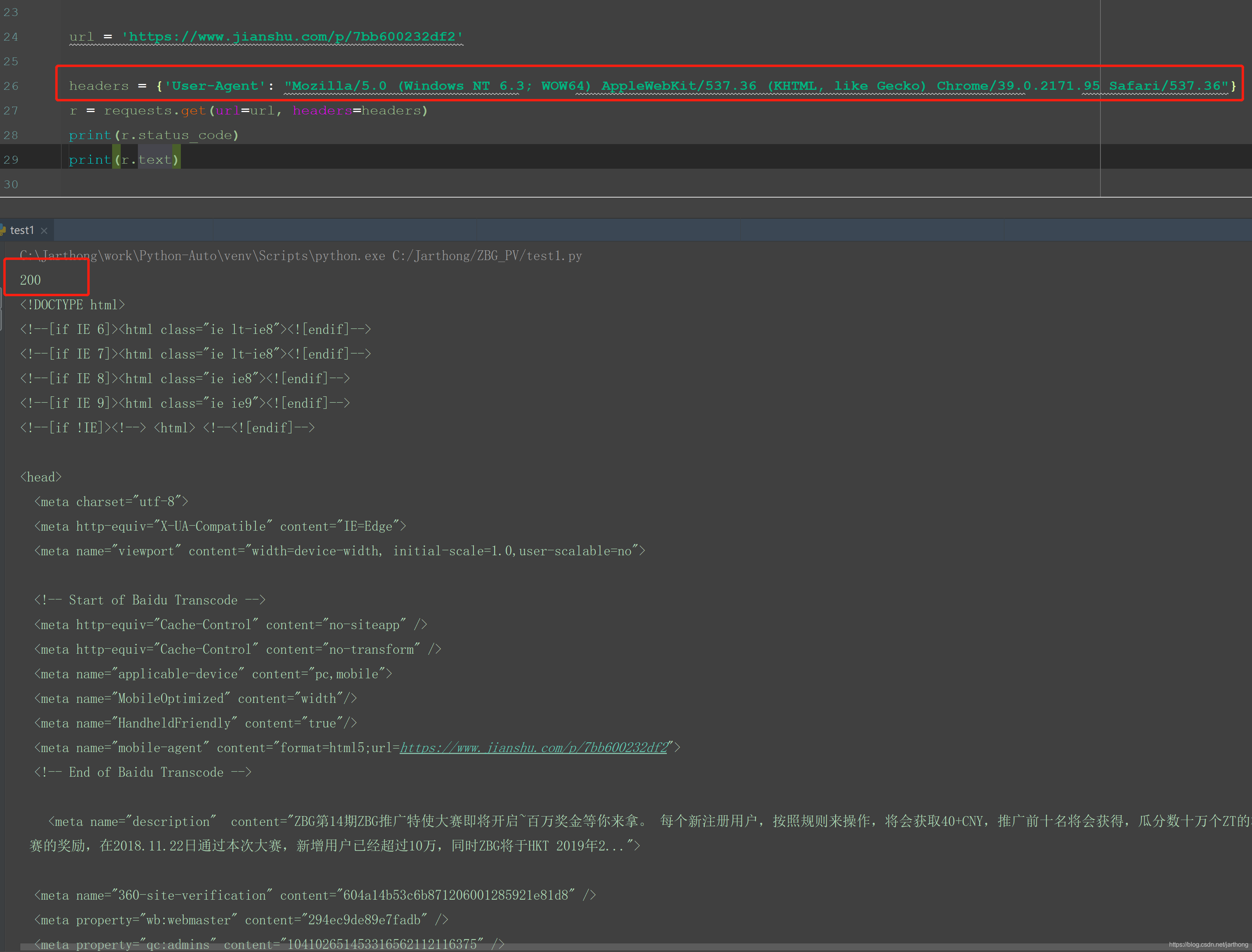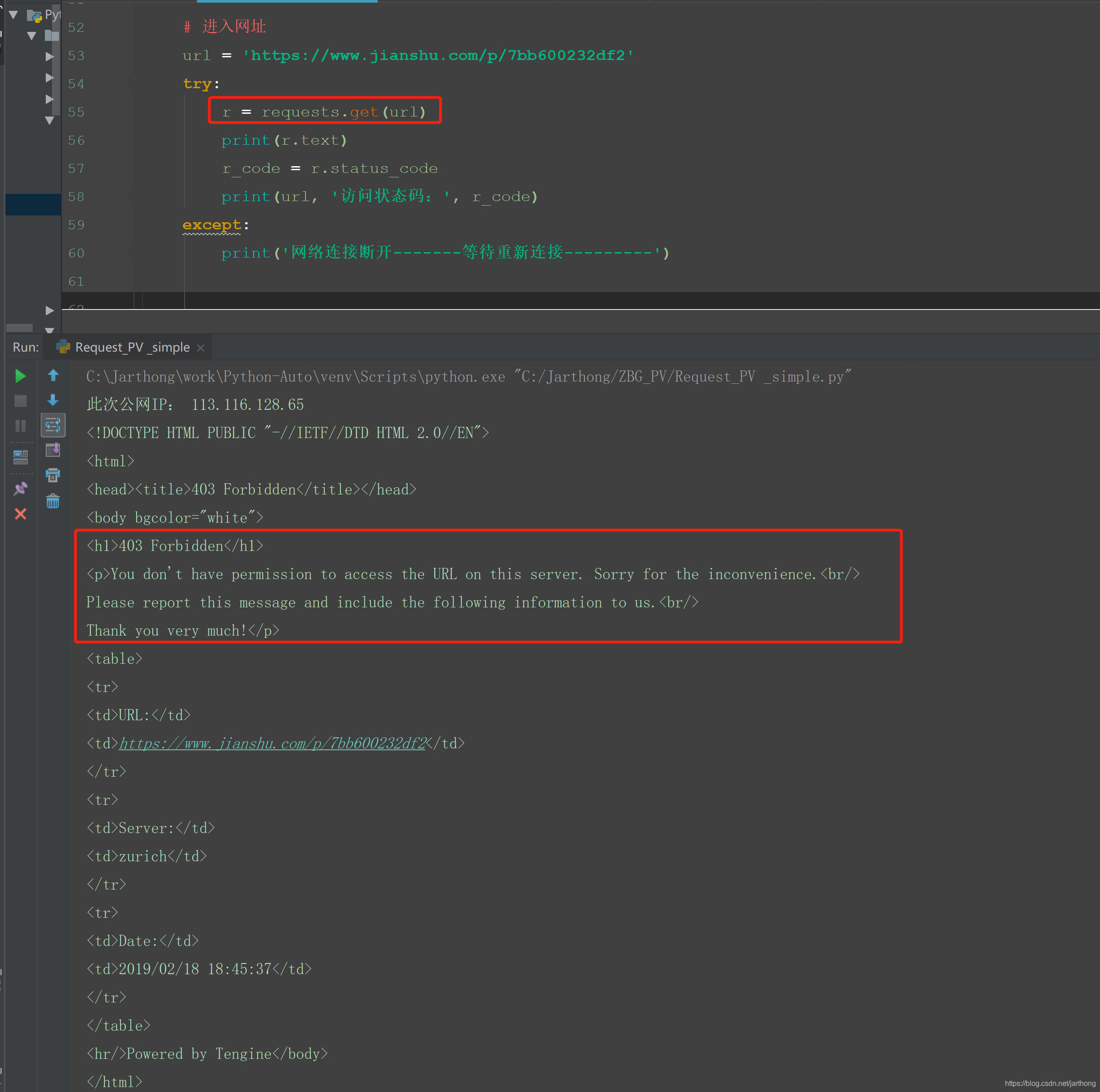 有些网站,如“简书”网站,直接使用浏览器打开网站的时候正常,但使用Python requests.get(url)这个方法请求接口,会出现以下报错: