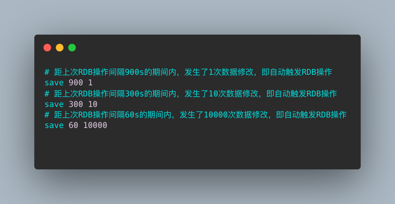 除了可以显示触发RDB持久化,Redis还提供自动触发机制,在 redis.conf 可以进行配置: