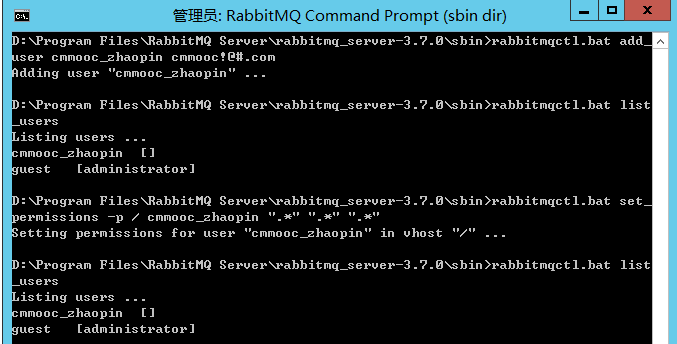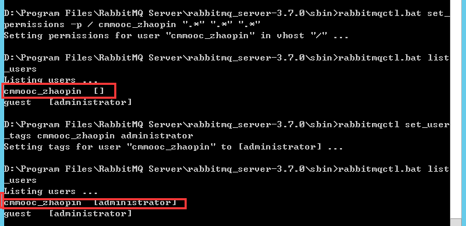 这里需要说一下的是,在给新创建的账号指定管理员权限时,按照之前的命令:rabbitmqctl.bat set_permissions -p / cmmooc_zhaopin ".*" ".*" ".*",执行后,并没有为其赋予administrator的权限,如下图所示: