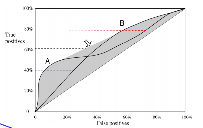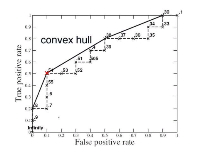 阴影区域被称作两个曲线的convex hull。在选择分类器时总是应该根据convex hull的上边界进行操作。例如,如果你的目标只是覆盖40%的真阳性,你应该选择方法A,这样可以提供5%的更低的假阳性率相对于B来说。如果你的目标是覆盖80%的真阳性,你应该选择方法B,因为B的假阳性率为60%,与A相比更低。如果你的目标是覆盖60%的真阳性,那么你应该结合A和B。