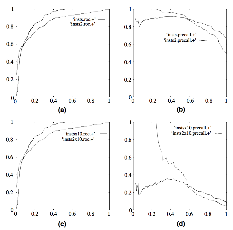 在上图中,a和c为ROC曲线,b和d为Precison和Recall曲线。a和b展示的是在原始测试集(正负样本平衡)的结果,c和d是将测试集中负样本的数量变为原来的10倍后分类器的结果。可以看出,曲线基本保持不变,而Precison和Recall变化较大。