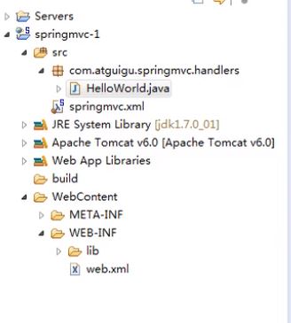 <context:component-scan base-package="com.atguigu.springmvc"></context:component-scan>在src下新建包 com.atguigu.springmvc.handlers,在该包下新建HelloWorld类