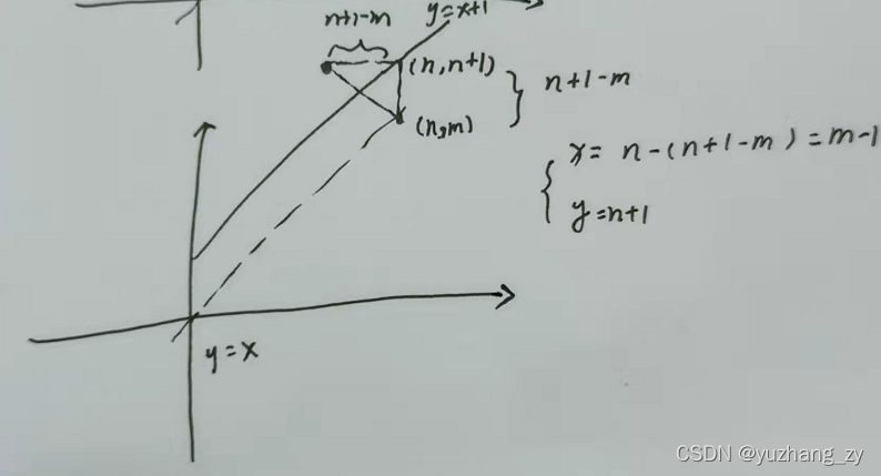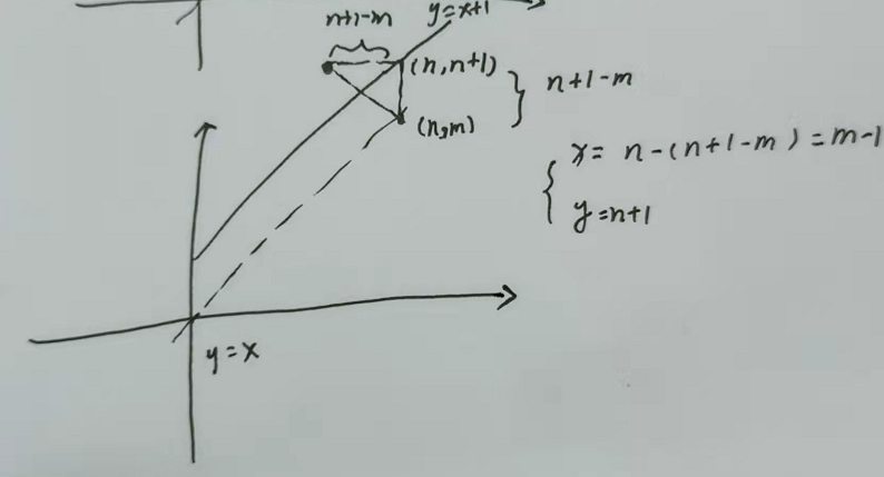 某城市的街道呈网格状,左下角坐标为 A(0,0),右上角坐标为 B(n,m),其中 n ≥ m。现在从 A(0,0) 点出发,只能沿着街道向正右方或者正上方行走,且不能经过图示中直线左上方的点,即任何途径的点 (x,y) 都要满足 x ≥ y,请问在这些前提下,到达 B(n,m) 有多少种走法。