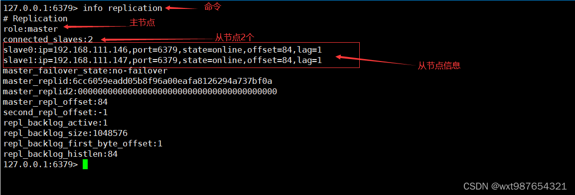 147主节点的从节点已变成两个,以前的主节点并不会重新夺回以前的主节点配置,而是成为新的主节点的从节点