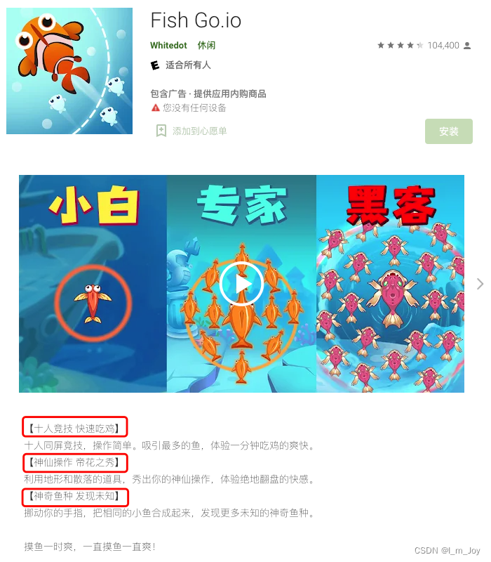 eg:以fish go游戏为例,应用描述生动有趣,能一眼吸引到目标用户。