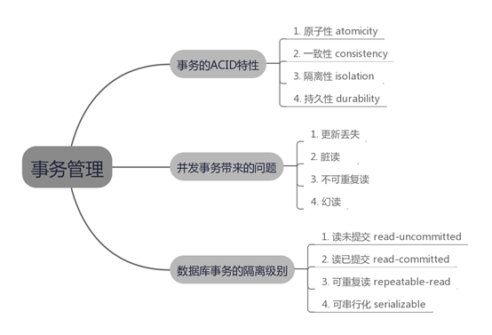 事务是数据库管理系统执行过程中的一个逻辑单位,由一个有限的数据库操作序列构成。当事务被提交给了DBMS(数据库管理系统),则DBMS(数据库管理系统)需要确保该事务中的所有操作都成功完成且其结果被永久保存在数据库中,如果事务中有的操作没有成功完成,则事务中的所有操作都需要被回滚,回到事务执行前的状态;同时,该事务对数据库或者其他事务的执行无影响,所有的事务都好像在独立的运行。