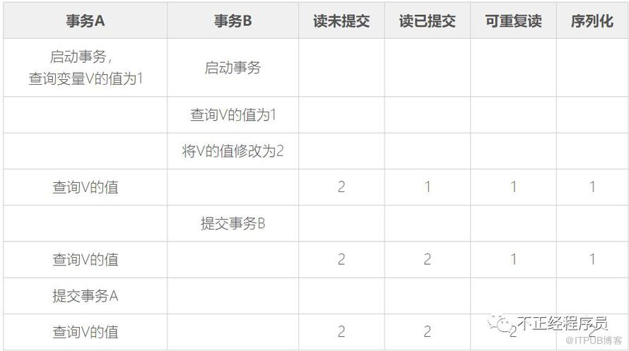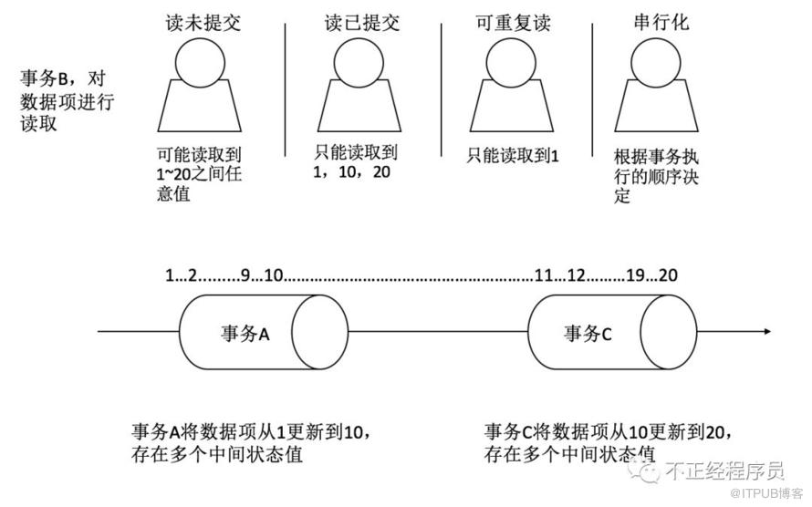 分别解释了四种事务隔离级别下,事务 B 能够读取到的结果。