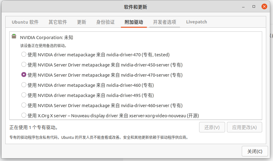 Ubuntu20.4的显卡驱动默认使用了XORG的显卡驱动,可以在软件&更新里面切换显示的驱动