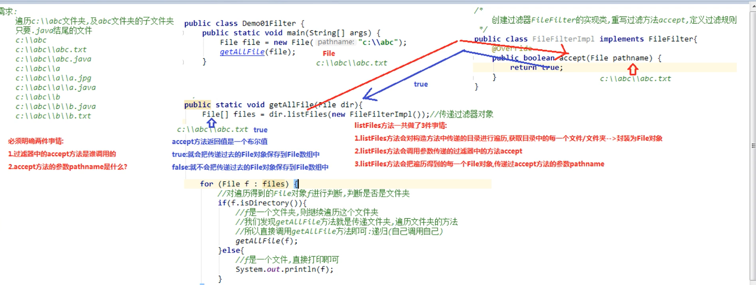 方法:boolean accept(File pathname) 测试指定的抽象路径名是否应包含在路径名列表中。accept方法测试指定抽象路径名是否应该包含某个路径名列表中