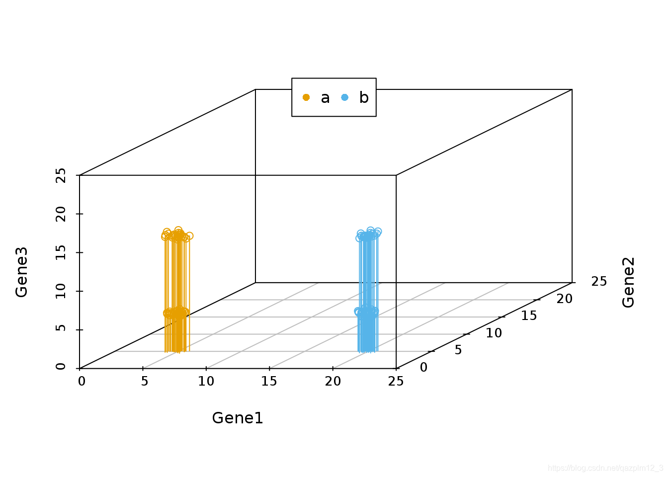 当我们向由Gene1和Gene2构成的X-Y平面做垂线时,可以很明显的看出,Gene2所在的轴对样品的分类没有贡献。因为投射到X-Y屏幕上的点在Y轴几乎处于同一位置。