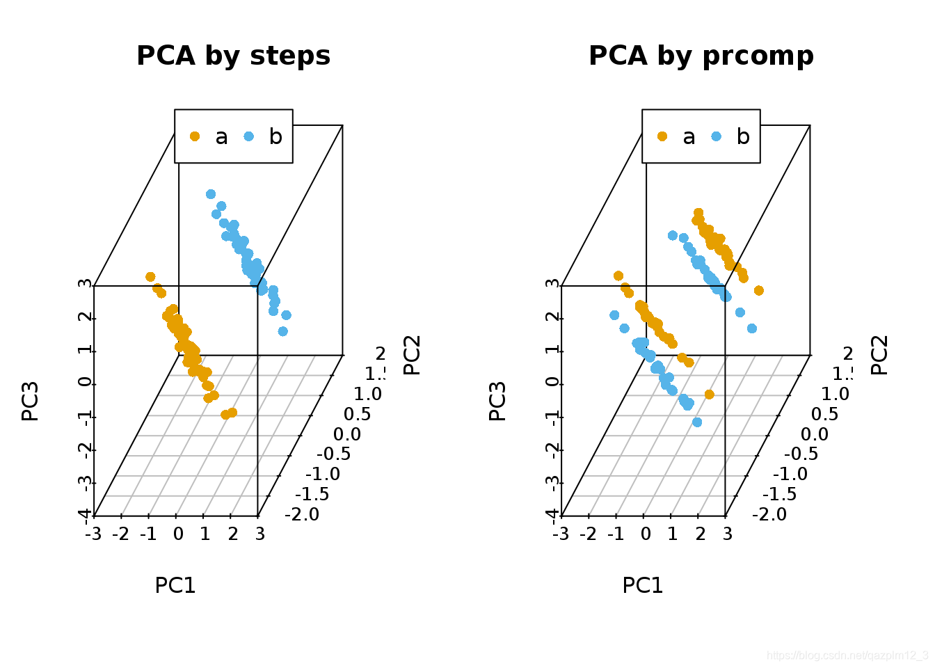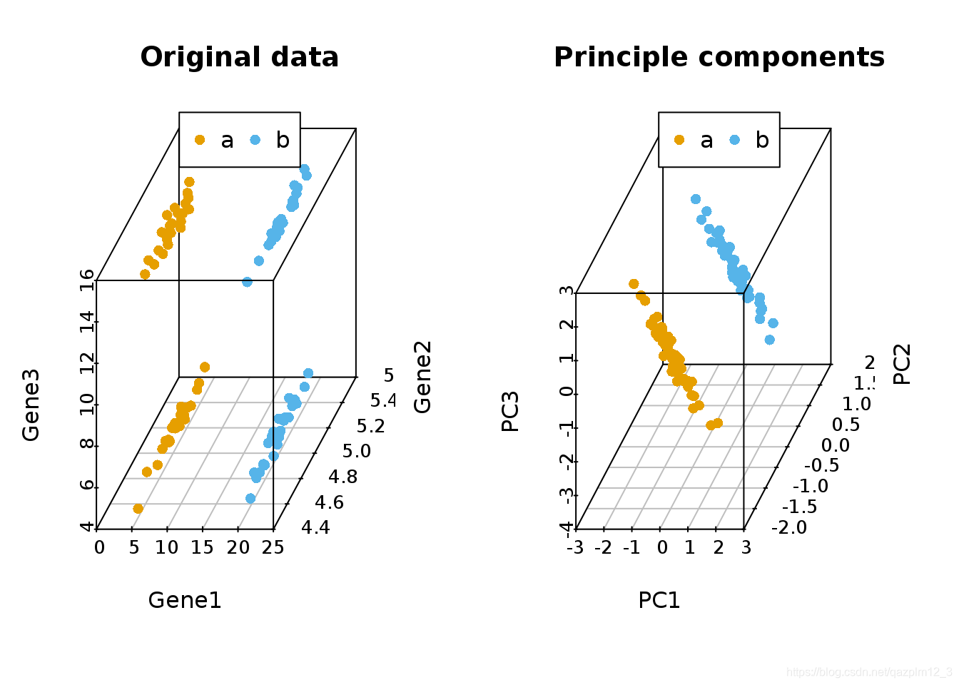 在上面的表达谱分析中,假如我们有1个基因,可以在线性层面对样本进行分类;如果我们有2个基因,可以在一个平面对样本进行分类;如果我们有3个基因,可以在一个立体空间对样本进行分类;如果有更多的基因,比如说n个,那么每个样品就是n维空间的一个点,则很难在图形上展示样品的分类关系。利用PCA分析,我们可以选取贡献最大的2个或3个主成分作为数据代表用以可视化。这比直接选取三个表达变化最大的基因更能反映样品之间的差异。(利用Pearson相关系数对样品进行聚类在样品数目比较少时是一个解决办法)