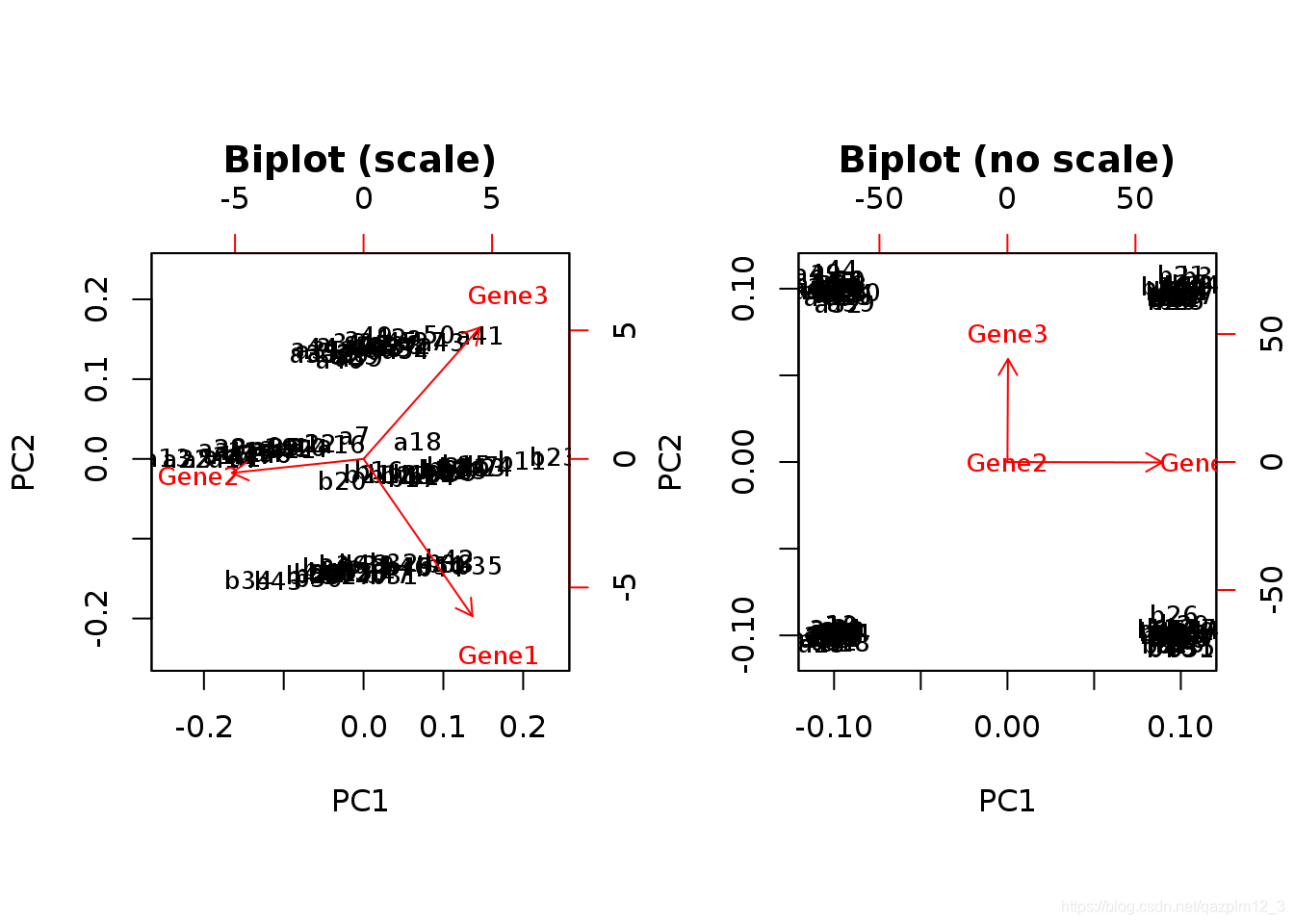 在测试数据中,scale后,三个主成分对数据差异的贡献度大都在30%左右,而未scale的数据,三个主成分对数据差异的贡献度相差很大。这是因为三个基因由于自身表达量级所引起的方差的差异导致它们各自对数据的权重差异,从而使主成分偏向于数值大的变量。
