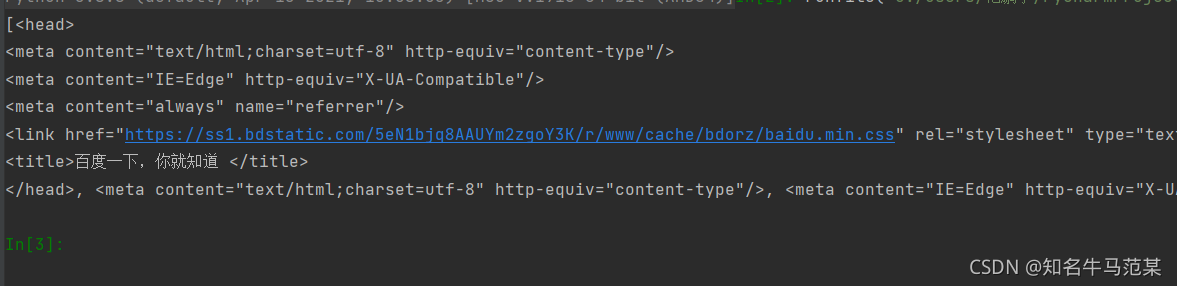 操作文档树最简单的方法就是告诉它你想获取的tag的name.例如想获取 <head> 标签,只要用 soup.head 会返回第一个搜索到的目标,如果想要全部查询可以使用bs.findAll()