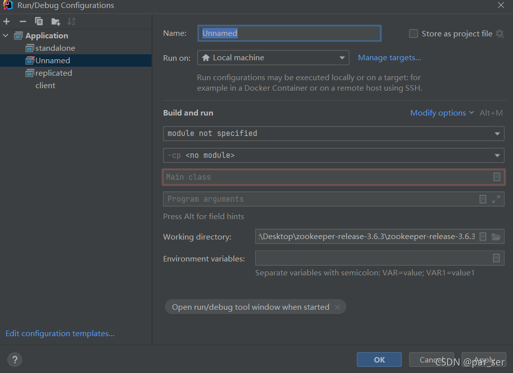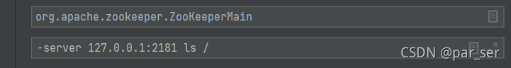 对于zookeeper服务端的启动配置,大体与上面相同,服务端的MainClass是org.apache.zookeeper.ZooKeeperMain,程序参数可以填写你想测试的zookeeper指令