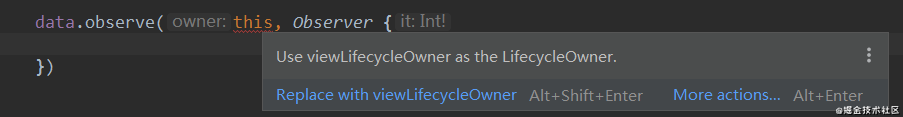 如果传递的LifecycleOwner参数为this,即Fragment时,会收到Android Studio的提醒,要求使用viewLifecycleOwner,或者直接标红,显示错误。如下图所示: