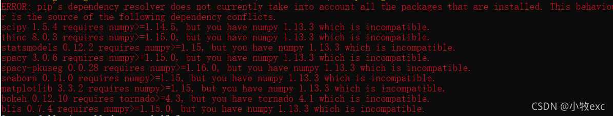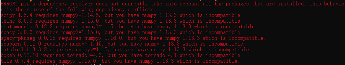 那就按照那个提示依次更新就好了。我自己是先更新numpy到1.19.5,然后就报错和我说 tornado版本不够,就按照提示更新就可以了。