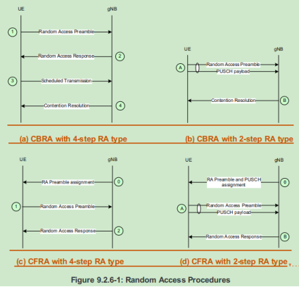 定义了2种RA过程:4-step RACH with MSG1和2-step RACH with MSGA。2种RA都支持CBRA和CFRA。