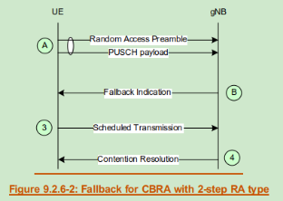 对于CBRA 2-step RA,UE发送MSGA,在收到MSGB且contention resolution成功时RA结束;如果收到MSGB包含Fallback Indication,UE应发送MSG3;如果发送MSG3后contention resolution失败,UE应重复发送MSGA。