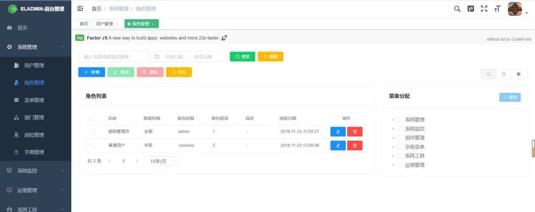 角色管理:对权限与菜单进行分配,可根据部门设置角色的数据权限