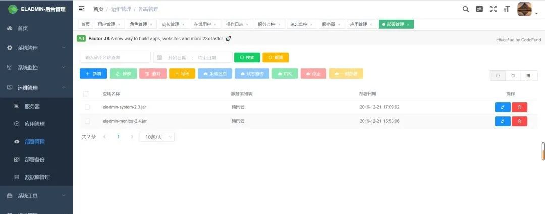 项目采用按功能分模块开发方式,将通用的配置放在公共模块,system模块为系统核心模块也是项目入口模块,logging 模块为系统的日志模块,tools 为第三方工具模块,包含了图床、邮件、七牛云、支付宝,generator 为系统的代码生成模块。