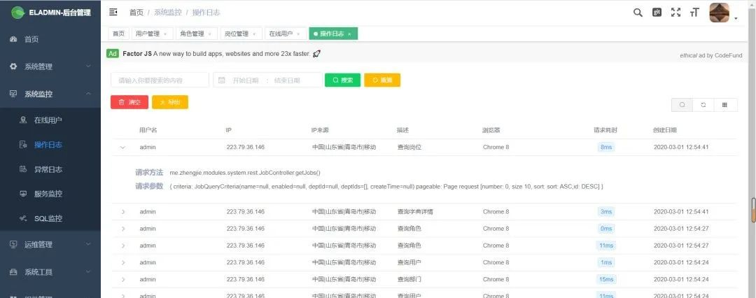 一个基于 Spring Boot 2.1.0 、 Spring Boot Jpa、 JWT、Spring Security、Redis、Vue的前后端分离的后台管理系统。