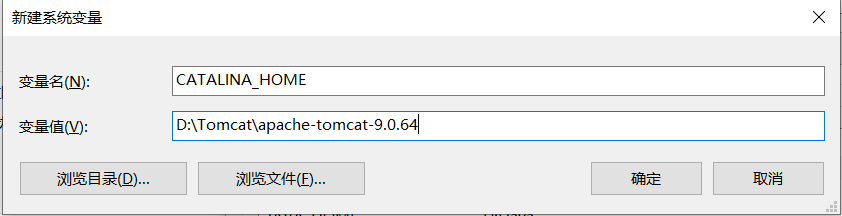 获取压缩包在D盘解压一下,然后环境配置。新建系统变量名:CATALINA_HOME,变量值:D:\Tomcat\apache-tomcat-9.0.64