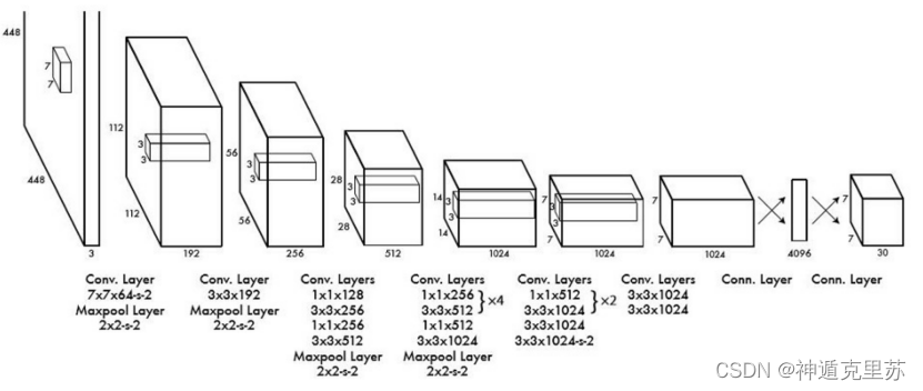 由于输入图像被分为SxS网格,每个网格包括B*5个预测量(x, y, w, h, confidence)和一个C类,所以网络输出是SxSx(5xB+C)大小。