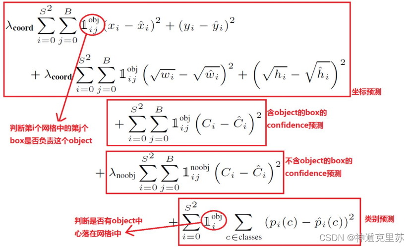 (3) 分类预测误差。即每个box属于什么类别,需要注意一个网格只预测一次类别,即默认每个网格中的所有B个bounding box都是同一类。所以,YOLO的最终误差为下: