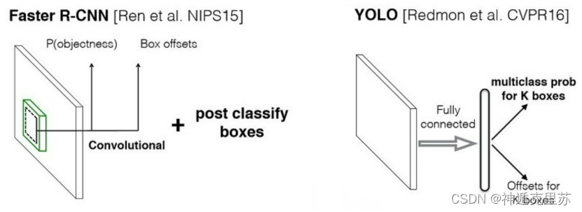 YOLO是一种目标检测算法,核心思想是将目标检测转化为回归问题求解,并基于一个单独的end-to-end网络,完成从原始图像的输入到物体位置和类别的输出。YOLO与Faster RCNN有以下区别: