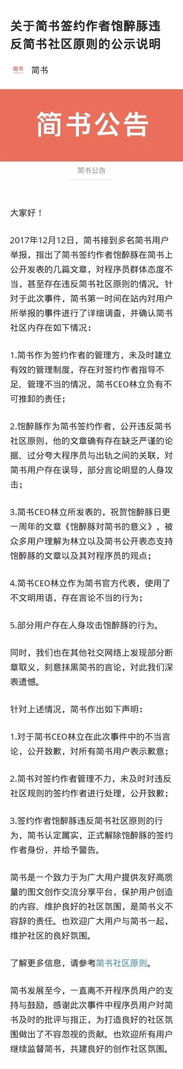 简书也公开致歉: