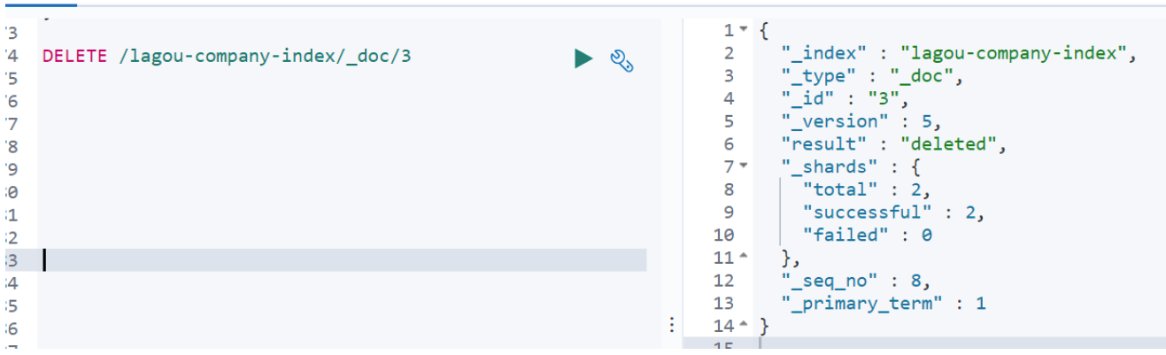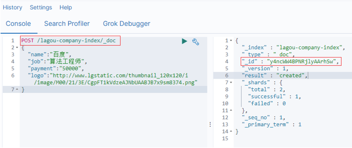 可以看到结果显示为: created ,代表创建成功。 另外,需要注意的是,在响应结果中有个_id 字段,这个就是这条文档数据的唯一标识,这个_id作为唯一标示,这里是Elasticsearch帮我们随机生成的id。