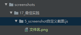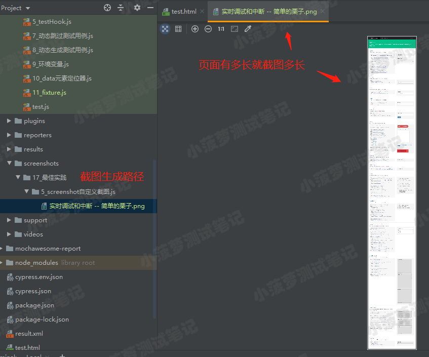 - 图片默认保存在 cypress/screenshots 文件夹下,可以在 cypress.json 修改默认文件夹路径(配置项 screenshotsFolder )