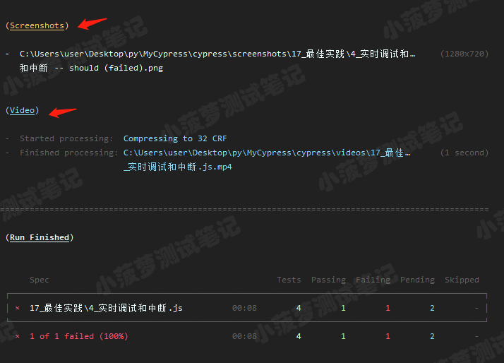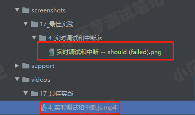 以 cypress run 方式运行测试时,当测试发生错误时,Cypress 会自动截图,并默认保存在 cypress/screenshots 文件夹下,而录屏会保存在 cypress/video 文件夹下