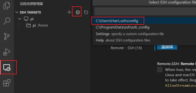 接下来,我们把鼠标移动到 ssh targets 处,点击“设置”按钮,选择上图右边的“...../.ssh/config”,我们来设置需要连接的树莓派的信息