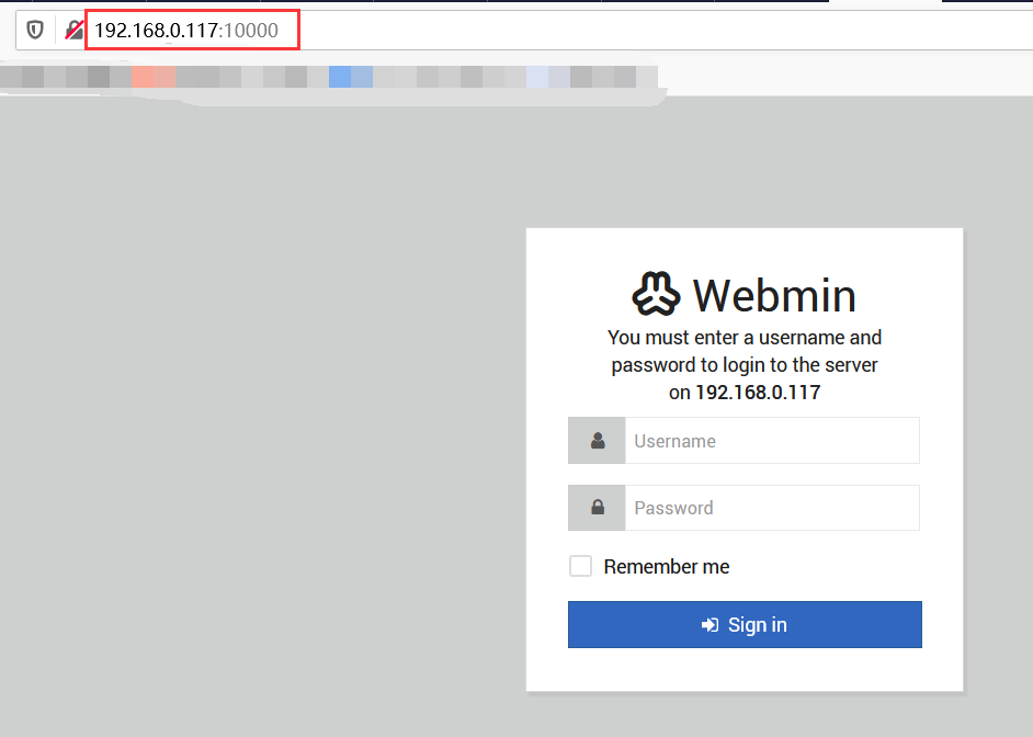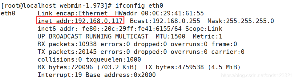 然后可以通过http://Linux系统IP地址:10000/进行访问,这里的IP地址如下图,所以在Windows系统下浏览器的地址栏输入http://192.168.0.117:10000/