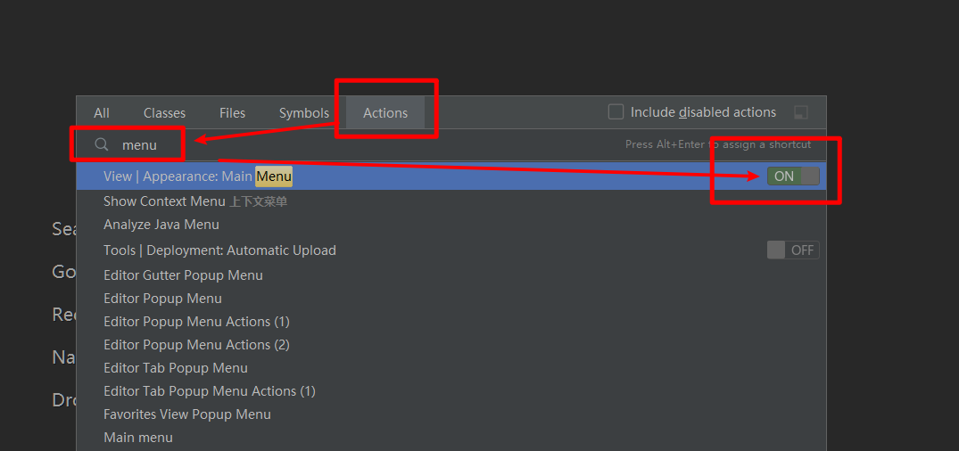 IDEA 顶部导航栏(Main Menu)不见了怎么办?如图,IDEA顶部的菜单栏不显示了Ctrl+Shift+A --- 选择Actions --- 输入menu 在Main Menu后边打开开关即可。工具栏正常显示。