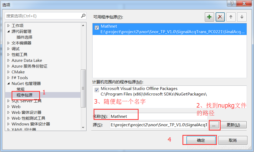 需要先添加一个程序包源,即添加自己下载的.nupkg文件存放的路径