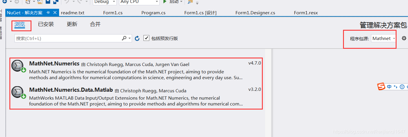 注意:MathNet.Numerics.Data.Matlab的版本不要太高,笔者使用4.0的版本 ,出现在vs2017下无法安装的情况。
