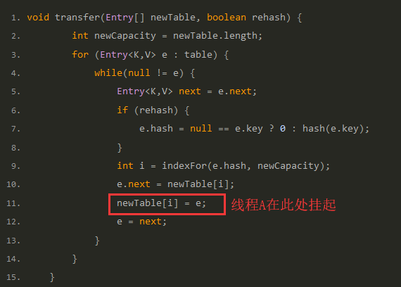 这段代码是HashMap的扩容操作,重新定位每个桶的下标,并采用头插法将元素迁移到新数组中。头插法会将链表的顺序翻转,这也是形成死循环的关键点。理解了头插法后再继续往下看是如何造成死循环以及数据丢失的。